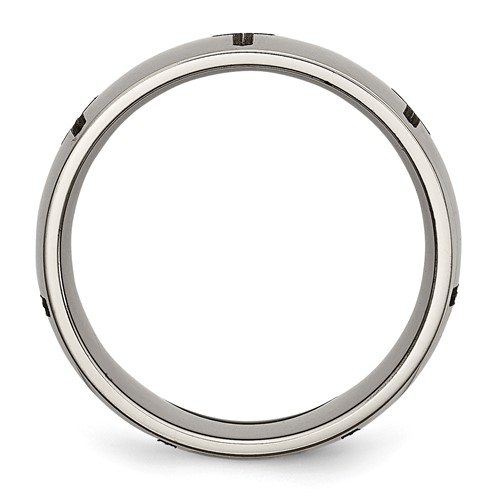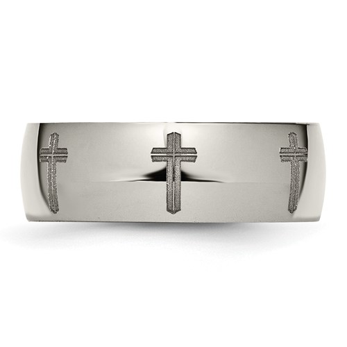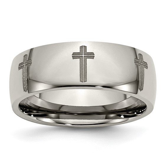 Titanium ring is decorated with laser engraved crosses. Domed center and polished finish. Width: 8mm. Comfort fit ring is made of commercially pure titanium, grade 4 [CP 4]. Imported. This style is available in half and whole finger sizes, 7-13.