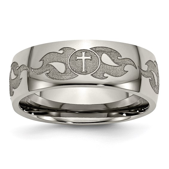 Domed titanium ring has crosses and flames. Polished finish. Laser engraved design. Width: 8mm. Comfort fit ring is made of commercially pure titanium, grade 4 [CP 4]. Imported. This style is available in half and whole finger sizes, 7-13.