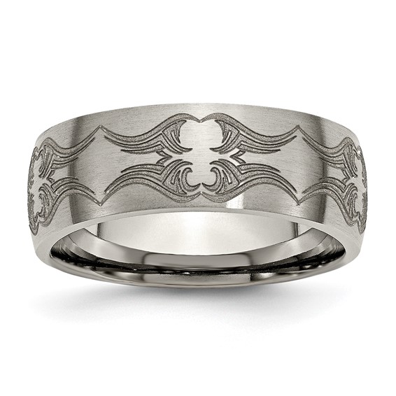 Domed titanium ring has a swirl design and a brushed finish. Width: 8mm. Laser engraved design. Comfort fit ring is made of commercially pure titanium, grade 4 [CP 4]. Imported. This style is available in half and whole finger sizes, 7-13.