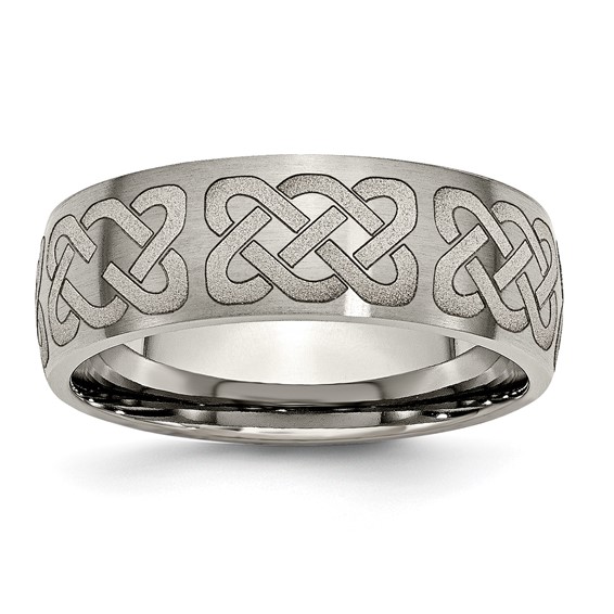 Domed titanium ring has a weave design and brushed finish. Laser engraved design. Width: 8mm. Comfort fit ring is made of commercially pure titanium, grade 4 [CP 4]. Imported. This style is available in half and whole finger sizes, 7-13.