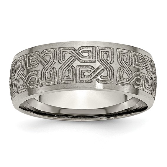 Domed titanium ring has a fancy weave design with a brushed finish. Laser engraved design. Width: 8mm. Comfort fit ring is made of commercially pure titanium, grade 4 [CP 4]. Imported. This style is available in half and whole finger sizes, 7-13.