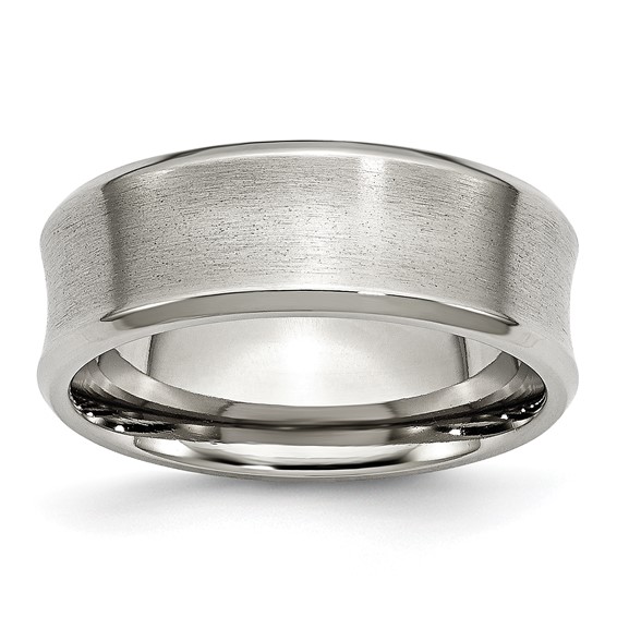 Beveled edge concave stainless steel ring with a brushed finish. Width: 8mm. Comfort fit ring. Imported. This style is available in half and whole finger sizes, 8-14.