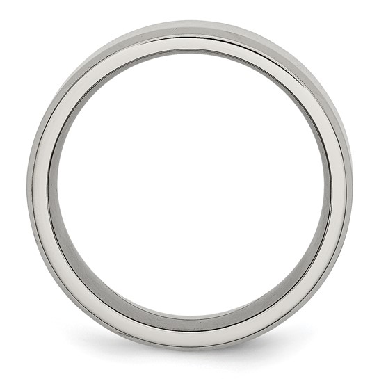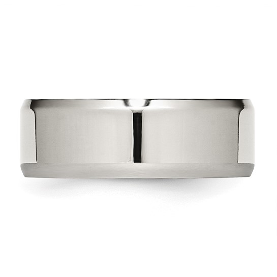 Beveled edge stainless steel ring with a polished finish. Width: 8mm. Comfort fit ring. Imported. This style is available in half and whole finger sizes, 6-13.