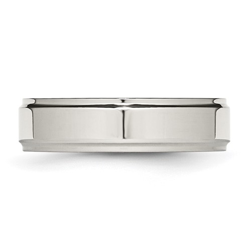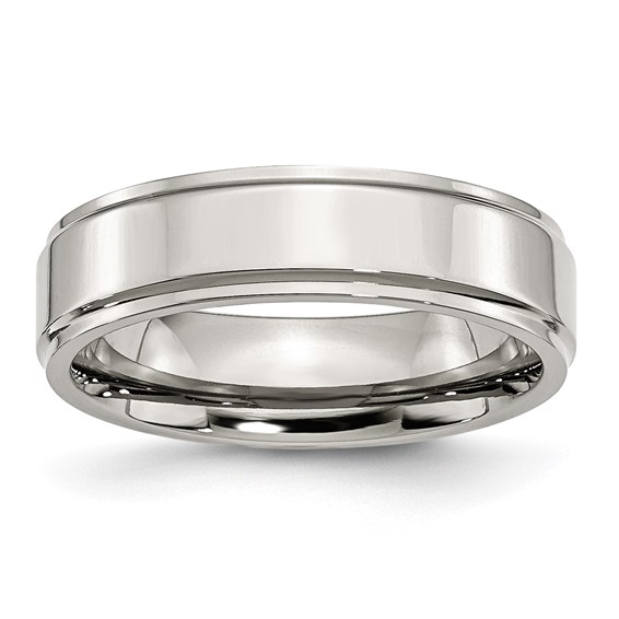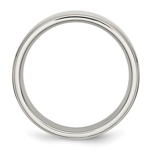 Ridged edge stainless steel ring with a polished finish. Width: 6mm. Comfort fit ring. Imported. This style is available in half and whole finger sizes, 6-13.