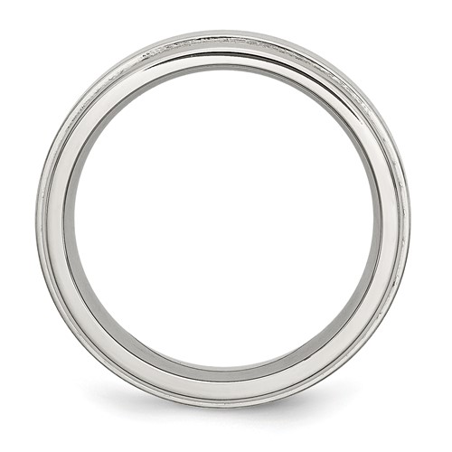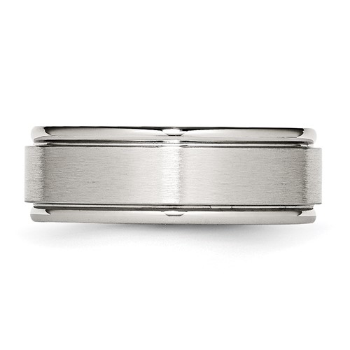 Ridged edge stainless steel ring with a brushed flat center and polished edge finish. Width: 8mm. Comfort fit ring. Imported. This style is available in half and whole finger sizes, 8-14.