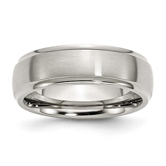 Ridged edge stainless steel ring with a brushed center and polished edge finish. Width: 7mm. Comfort fit ring. Imported. This style is available in half and whole finger sizes, 7-13.