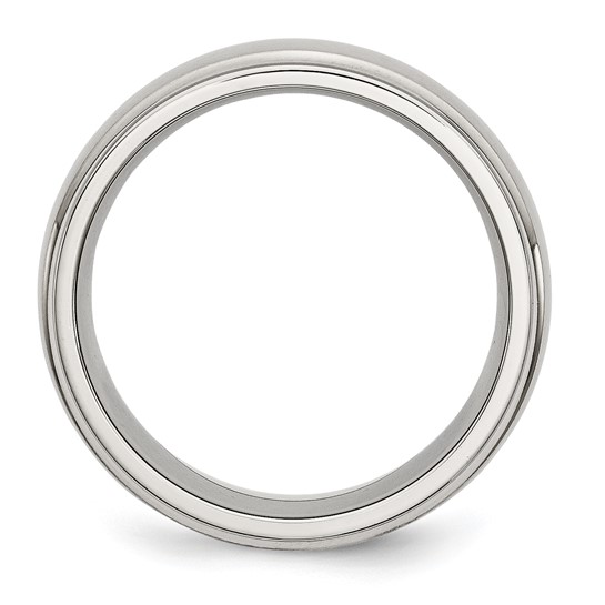 This stainless steel ring has a brushed domed center and polished ridged edges. Width: 8mm. Comfort fit ring. Imported. This style is available in half and whole finger sizes, 8-14.