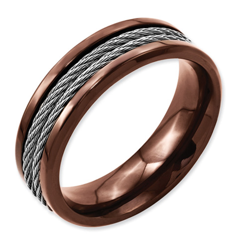 Stainless steel ridged edge ring with a polished finish. Grey cable inlay. Chocolate IP-plated. Width: 7mm. Comfort fit ring. Imported. This style is available in whole and half sizes, 7-13.