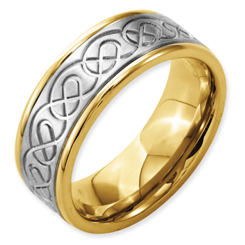 Stainless steel ring with a polished and brushed finish. Yellow IP-plated. Width: 8mm. Comfort fit ring. Imported. This style is available in whole and half sizes, 7-13. Weight: Approx. 8.18 grams