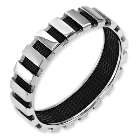 Stainless steel ring has black-plated wire and gray bars all the way around the ring. Width: 6mm. Comfort fit ring. Imported. This style is available in whole and half sizes, 6-13. Weight: Approx 3.48 grams.