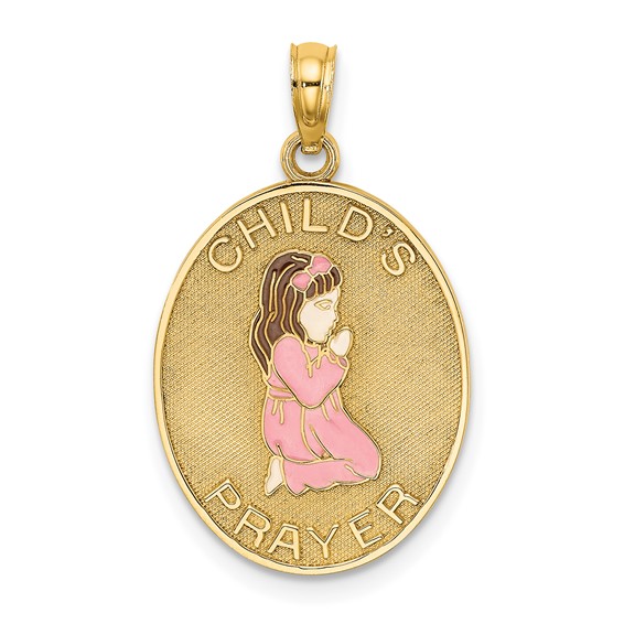 Nght time prayer with girl praying pendant is reversible. Prayer reads: NOW I LAY ME DOWN TO SLEEP, I PRAY THE LORD MY SOUL TO KEEP GUIDE AND GUARD ME THROUGH THE NIGHT AND WAKE ME WITH THE MORNING LIGHT, AMEN. Dimensions: 1 inch tall with bail by 5/8 inch wide. Weight: 2.1 grams. Made in USA.