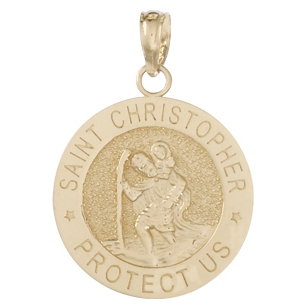 This small 14kt yellow gold Saint Christopher medal pendant has the inscription SAINT CHRISTOPHER PROTECT US. Item size: 1/2in x 1/2in without bail. Weight:1.8 grams. Made in the USA.