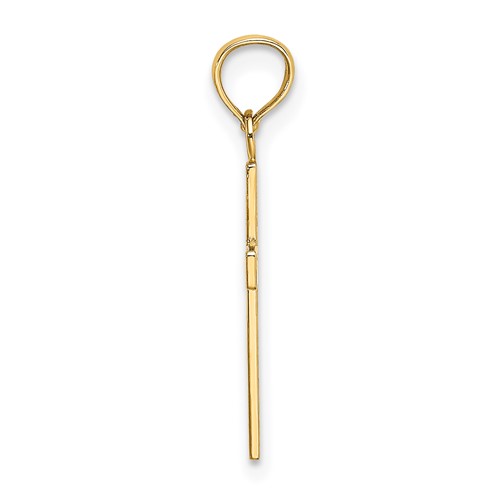 14K yellow gold block cross with textured design center. Weight: 0.5 grams. Measures 20mm x 8mm including bail. Made in USA.