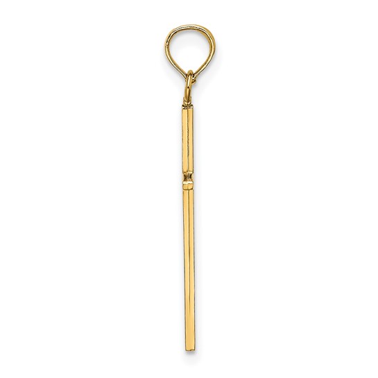 3-D high polished stick cross is made of 14K yellow gold. Item size: 3/4in x 3/8in. Fits up to a 3mm wide chain. Weight: 0.5 grams. Made in USA.