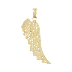 Textured angel wing pendant is made of 14K yellow gold. Dimensions: 1in x 5/16in. Weight: 1.1 grams. Made in USA.