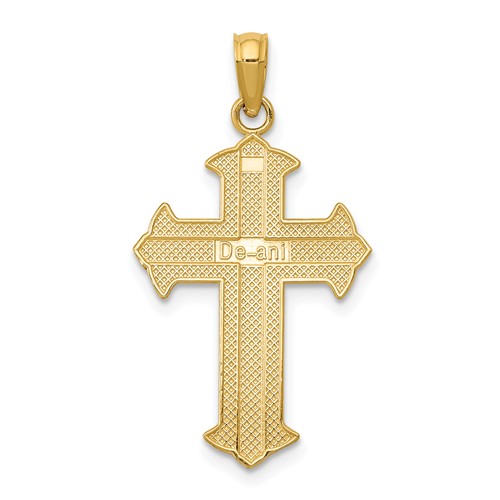 14k yellow gold cross with high polished center and outlined arrow tips. Weight: 0.8 grams. Dimensions: 1/2in x 3/4in without bail. Made in Peru.