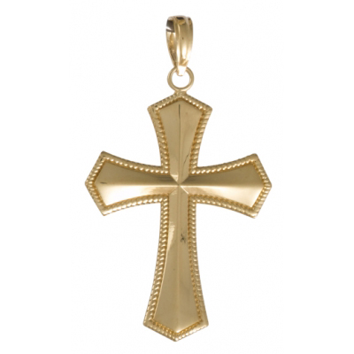 14K yellow gold 2-D beveled cross pendant with beaded edge. Weight: 1.8 grams. Dimensions: 11mm x 17mm.