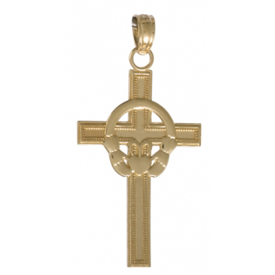 14kt yellow gold high polished and textured block cross pendant has a Claddagh center. 3/4in x 1/2in. Weight: 1.0 grams. Made in the USA.