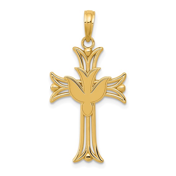High polished dove on cut-out cross pendant is made of 14k yellow gold. Weight: 1.3 grams. Dimensions: 24mm x 16mm without bail. Made in Peru.