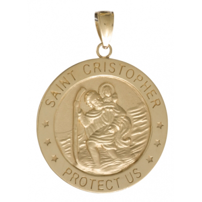 14K yellow gold high polished and satin finish Saint Cristopher medal pendant. Measures 19mm x 19mm without bail. Inscription: SAINT CRISTOPHER PROTECT US. Weight: 4.7 grams. Made in the USA.