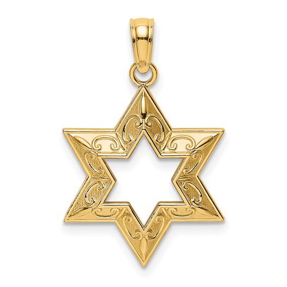 Textured and cut-out Star of David pendant is made of solid 14k yellow gold. Measures 20mm x 12mm. Weight: 1.1 grams. Made in USA.