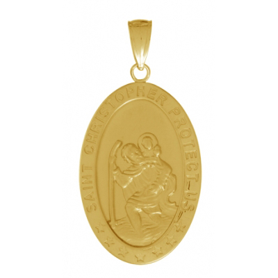 14K yellow gold high polished and satin finish Saint Christopher oval medal. Weight: 3.3 grams. Measures 31mm by 14mm.