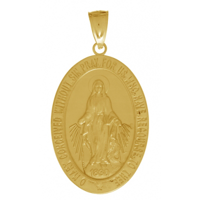 14K yellow gold high polished and satin finish oval shaped miraculous medal. Weight: 5.0 grams. Measures 33mm by 17mm including bail. Made in the USA.