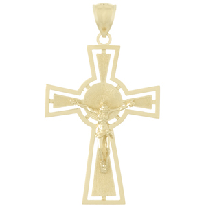14K yellow gold crucifix pendant with center circle. Weight: 4.2 grams. Dimensions: 46mm x 26mm.