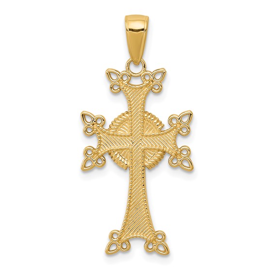Armenian cross pendant is made of solid 14k yellow gold. Measures 7/8in x 1/2in. Weight: 1.7 grams. Fits up to a 3.5mm wide chain. Made in the USA.