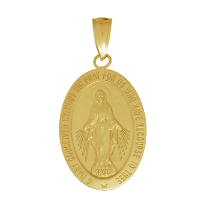 High-polished and satin finish oval shaped miraculous medal pendant is made of 14kt yellow gold. Weight: 2.3 grams. Measures 5/8in x 1/2in without the bail. Made in the USA.