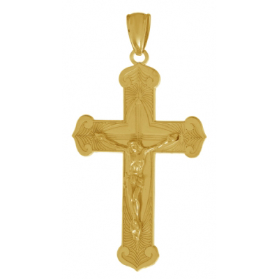 Crucifix pendant with Jesus on finely engraved cross is made of polished 14kt yellow gold. Item size: 1 1/2in x 7/8in without bail. Weight: 1.9 grams. Made in the USA.