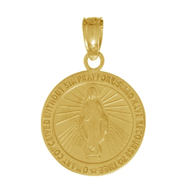 14K yellow gold round miraculous medal pendant with high-polished and satin finish. Weight: 1.0 grams. Item diameter: 15mm. This item is a little smaller than a dime.