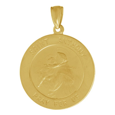 14K yellow gold high polished and satin finish Saint Anthony round medal. Weight: 4.0 grams. Item size: 3/4in x 3/4in without bail. Made in USA.