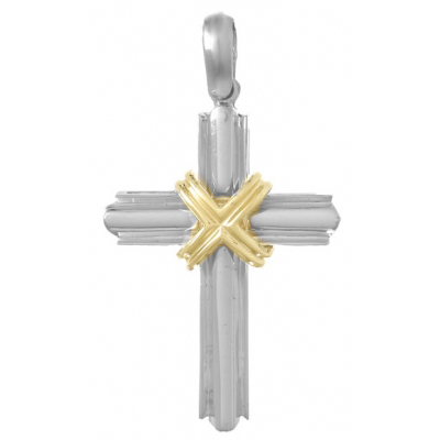 Sterling silver cross pendant with ridges and 14k yellow gold center. Measures 46mm by 24mm with bail. Made in USA.