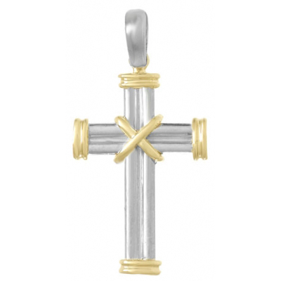Sterling silver double ridge cross pendant with 14k yellow gold end accents and center detail. Measures 1 1/4in by 3/4in without bail. Made in USA.