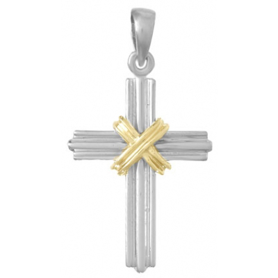 Sterling silver ribbed cross pendant with 14k yellow gold center accent. Measures 39mm by 18mm.