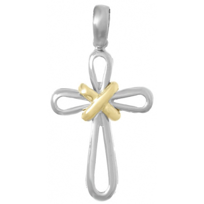 Sterling silver round cross pendant with 14k yellow gold center accent. Measures 41mm by 20mm including bail. Made in USA.