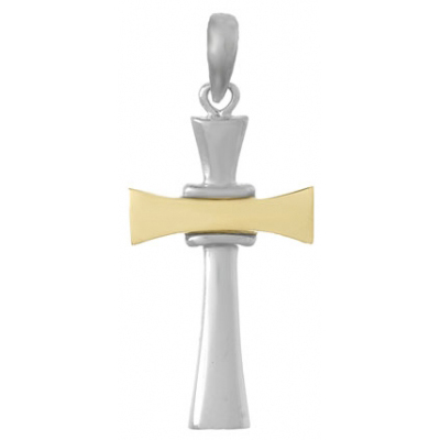 Sterling silver high-polished cross pendant with 14k yellow gold center. Measures 33mm by 13mm.