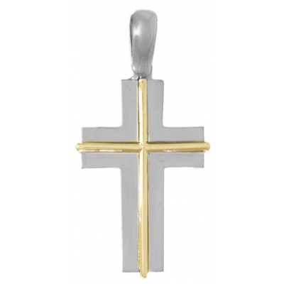 Sterling silver block cross pendant with 14k yellow gold center accent. Measures 7/8in by 5/8in without bail. Fits up to a 3mm wide chain. Made in USA.