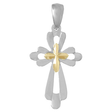 Sterling silver cross pendant with cut-out center 14k yellow gold center accent. Measures 28mm by 13mm.