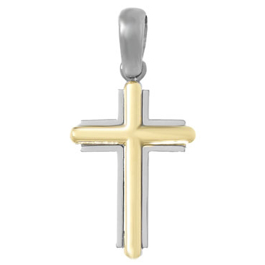 Sterling silver cross pendant with 14k yellow gold center accent. Measures 1/2in x 3/4in without bail. Made in USA.