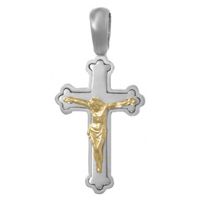 This sterling silver budded crucifix cross pendant has a 14kt yellow gold Jesus accent. Cross dimensions: 22mm by 14mm. Made in the USA.