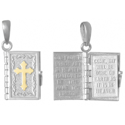 Sterling silver 3-D holy bible book pendant with 14k yellow gold cross on cover accent. Moveable pages with Lord's Prayer on the inside with ribbed texture background. Dimensions: 22mm x 12mm closed. 22mm x 22mm open. Dimensions include bail. Made in the USA.
