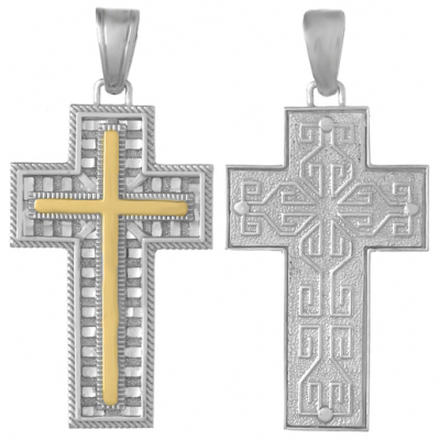 Sterling silver block 3-D cross pendant with 14k yellow gold center accent and textured reverse side. Measures 41mm by 19mm.