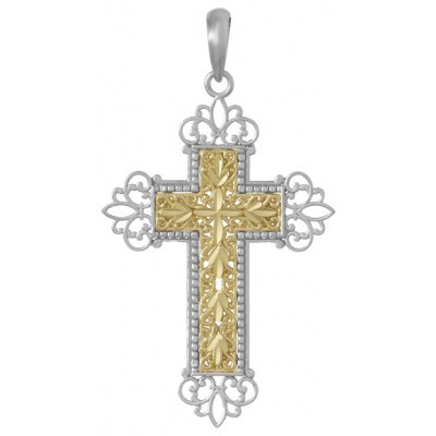 Sterling silver 2-D textured filigree cross pendant with 14k yellow gold center and floral cut-out tips. Item size: 1in x 1 3/8in. Made in USA.