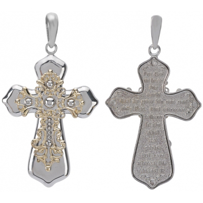 Sterling silver and 14k yellow gold two dimensional high polished cross pendant with John 3:16 on the reverse side. Measures 38mm by 21mm.