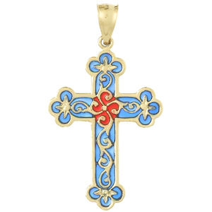 14k yellow gold cross pendant with translucent blue and red enamel. Dimensions: 5/8in x 1in without bail. The bail fits up to a 3.5mm wide chain. Approximate weight: 1.9 grams. Made in USA.