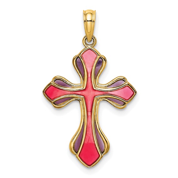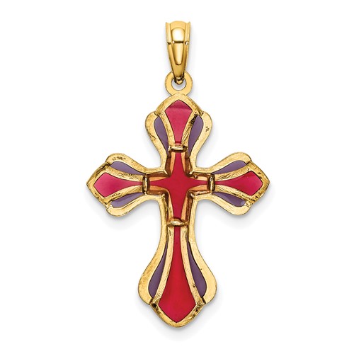 This ladies' 14k gold cross pendant has pink and purple translucent enamel. Measures 3/4in x 5/8in. Fits up to a 3mm wide chain. Through the use of transparent enamel, we have created brilliant stained glass pendants as remarkable as authentic church windows. Weight: 0.9 grams. Made in USA. Available while supplies last.