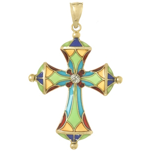 This multi-colored translucent enamel cross pendant is made of 14k yellow gold. Item size: 1in x 7/8in. Through the use of transparent enamel, we have created brilliant stained glass pendants as remarkable as authentic church windows. Weight: 1.7 grams. Made in USA.