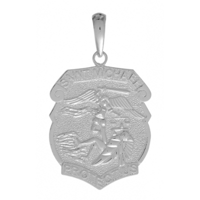 Sterling silver Saint Michael Protect Us shield pendant has a polished and textured finish. Weight: 3.1 grams. Item height: 3/4in without bail. Made in USA. Available while supplies last.